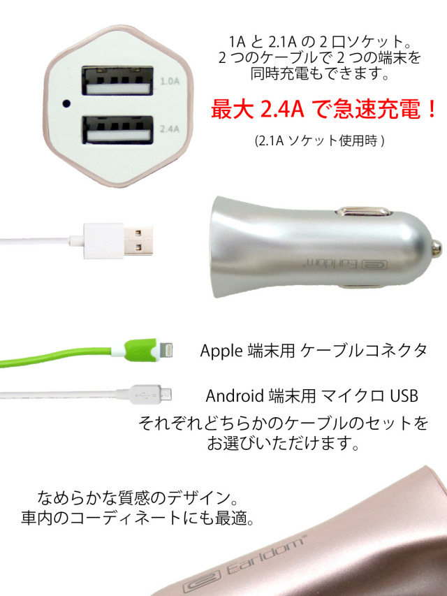 【2.4A超急速充電!】ドゥアルUSBシガーソケットカーチャージャー USBケーブル付属 アルミニウム製シガーソケット急速充電器 2口同時充電USBポート 2色展開iPhone/Andorid用の2つから選べる1mの急速充電ケーブルが付属したUSBダブル給電可能なシガーソケットカーチャージャー。タブレットへの給電も出来ちゃいます。最大2.4Aでの急速充電が可能です!ケーブルとチャージャーを別々で買うより断然オトク!スマートフォン購入時に付属の充電機と比べ、体感で約3倍の充電の早さ!車での限られた時間で急速充電を行えるので、ご自身だけではなく、同乗者のかたへの充電ポート提供もスムーズなります!アルミニウム製で汚れが付き難く清潔感のあるスマートなデザインの充電器です。カラーは全2色からご選択が可能です。