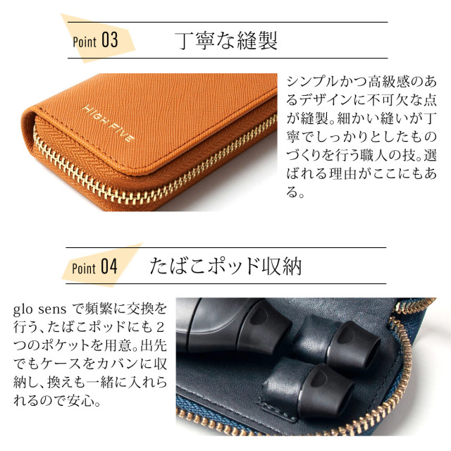 ブランド:HIGH FIVE[スペック] ・glo sens用ポケット × 1・交換たばこポッド用ポケット × 2"オールインワンケースでカバンの中もスマートに整頓"glo sens用キャリーケース特徴的なフォルムの本体と交換用タバコポッドをジャストに収納する専用設計のキャリーケース。充電もそのまま。gloポケットに充電用ホールを設計。本体をポケットから出さずに、そのまま充電可能です。※ご利用のモニター、ディスプレイにより若干色味に差がある場合がございます。ご了承ください。※商品の生産時における装飾等は海外にて手作業で行っており、多少の差異がある場合がございます。ご了承くださいませ。・メイン収納×1小さくてどこかレトロ。貴方に映えるミニポーチ大きすぎると取り回しが面倒...そんな悩みを解決する、一日持ち回すのにちょうどいい気軽なサイズです。コンパクトだけど収納もしやすい。ポーチとしての性能も十分です。無意識に馴染むベストなサイズ感丈夫であたたかな肌触りの牛革が高級感あるカジュアルさを演出します。※ご利用のモニター、ディスプレイにより若干色味に差がある場合がございます。ご了承ください。※商品の生産時における装飾等は海外にて手作業で行っており、多少の差異がある場合がございます。ご了承くださいませ。