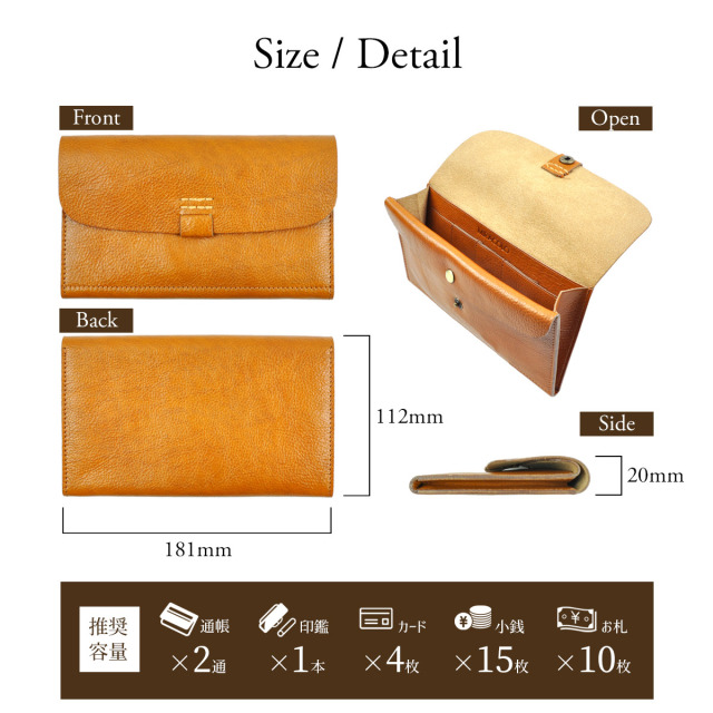 " 通帳ケースde銀行へGO " 通帳ケースに+α 通帳はもちろん キャッシュカード、お札、小銭、印鑑なども 大容量でちょどいいサイズ感 手持ちでも バッグに入れても ちょうどいいサイズ感に設計された お出かけ用通帳ケース 世界有数のレザー生産地イタリアの本革イタリアンレザーを使用。 熟練された職人の技術で細部までこだわり製作され、 「縫製、折り、塗り。」 どれを取っても一級品の仕上がりです。